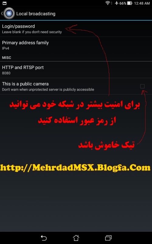 در قسمت Local Broadcasting یک Login/Password برای خود اختصاص دهید این به این خاطر است که امنیت شما در زمان ورود به پنل خود در شبکه داخلی مرورگر کامپیوتر و ... بالا برود ( انجام این مرحله اختیاریست )