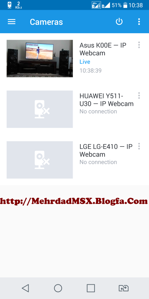 BL-IP Camera ، IP Cam Viewer یا انواع برنامه های دیگر که به راحتی در گوگل پلی قابل دانلود است استفاده کنید این برای زمانی است که شما انتقال تصویر نمی خواهید و فقط می خواهید مانند: دوربین های بیبی کم ( Baby Cam ) که برای نوزاد ، افراد سالمند ، در اتاق دیگر هستند استفاده کنید یا بخواهید قسمتی از منزل خود را در شبکه داخلی ببینید ( امنیت بالا )